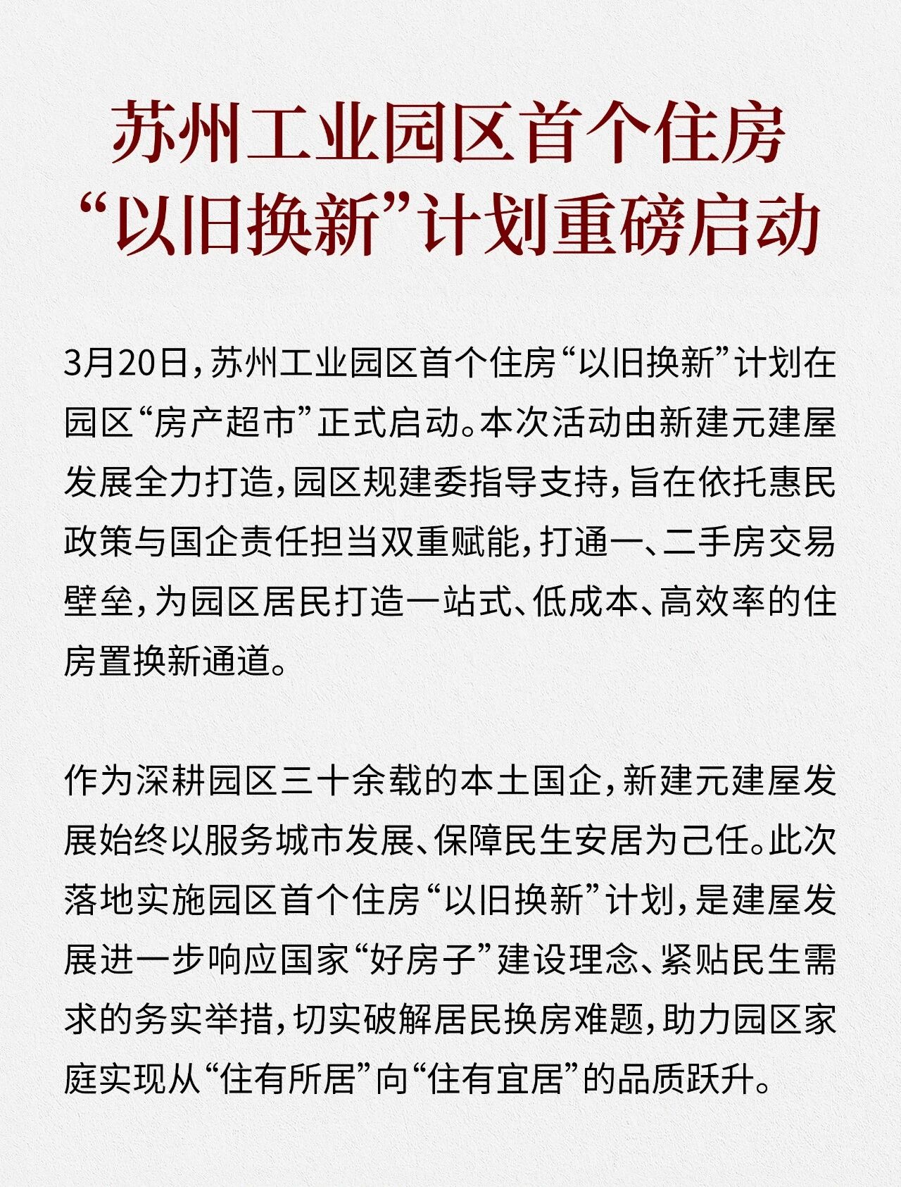 3月20日,苏州工业园区首个住房“以旧换新”计划正式启动。
