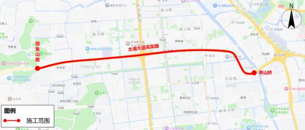 太湖大道高架路(寒山桥-团鱼山路)双向道路约14.4公里道路,施工期间需临时动态管控2条机动车道,其余1条车道按交通标识指引减速通行,并动态临时管控上匝道。
