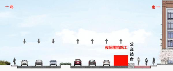 采用夜间施工,施工时间为每日22:00-次日5:00,施工占用公交站台区域,施工期间机动车与非机动车正常通行。