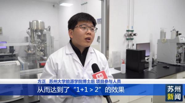 苏州大学能源学院博士后,项目参与人员方正介绍,硅电池与钙钛矿结合,从而达到了“1+1>2”的效果,使一个器件光电转换效率性能,可以达到接近35%的水平,成本仅是航空航天常用的砷化镓电池成本的1%,同时它是可变形的,这样它就可以拓宽很多的应用场景。