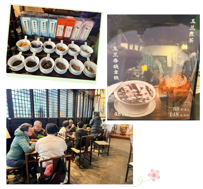 在紧邻玉兰树的茶室院内,同样人声鼎沸。为方便游客静坐赏花,茶室推出玉兰花季限定饮品,涵盖咖啡与茶两大系列。