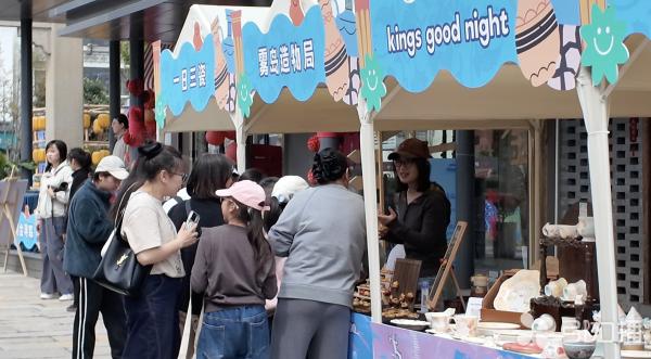 春日暖阳下,各个摊位前围满了好奇的市民与游客。在“夕阳下的闲闲子”摊位,主理人孙甜甜向顾客介绍着她以玻璃为材质的创作。“我的作品多以自然界为灵感,海洋系列有珊瑚、章鱼,花卉系列有鸢尾花、马蹄莲。”身为景德镇陶瓷大学陶瓷与玻璃专业的毕业生,孙甜甜将所学化为一件件晶莹剔透的杯盏、饰品。不远处,“雾岛造物局”摊位色彩明艳的面包黏土挂饰吸引了许多小朋友的目光。工作人员李婧蕾介绍,这些挂饰原材料都是面粉,“我们像做烘焙一样塑形,再手绘图案,最后用树脂封层,可以做成钥匙扣、冰箱贴”。这些充满巧思的作品备受青睐,仅半天就售出十多个。市民沈女士带着孩子逛得津津有味:“东西很特别,不是商场里能买到的,能感受到手艺人的用心。”