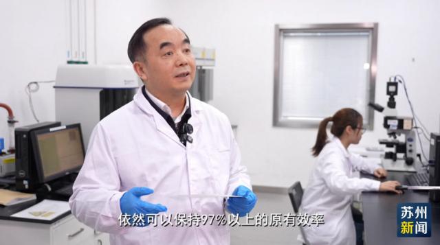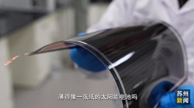 你见过能弯折,薄得像一张纸的太阳能电池吗?它就诞生在苏州大学。苏州大学党委书记张晓宏介绍,这个电池柔软而且很轻,光电转换效率超过了33%,远远高于现在在大规模使用的硅基光伏技术,它的机械稳定性在4万次弯折的情况下依然可以保持97%以上的原有效率。
