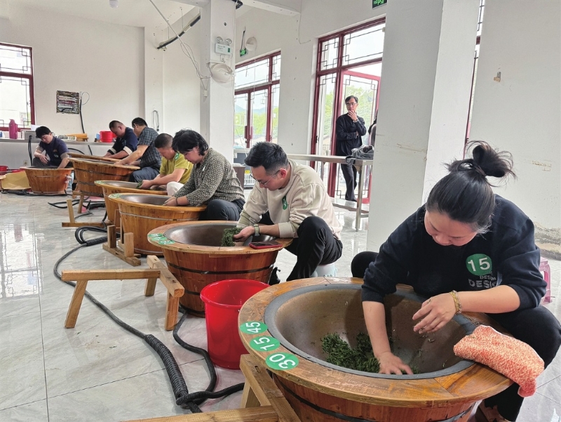 炒制完成的茶叶,被送进评审室,一字排开。评委们按照外形、汤色、香气、滋味、叶底五个维度,对每一份茶样进行打分,再结合选手的现场操作表现进行综合考核,力求精准评选出兼具技艺与水准的炒茶能手。