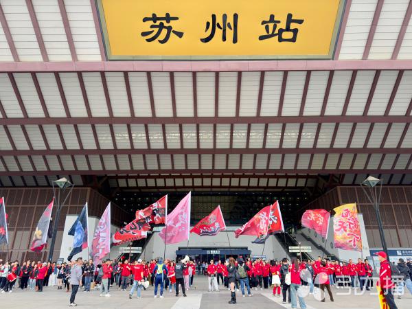 4月11日下午1时30分,苏州站南广场战旗猎猎、鼓声震天。距离2026赛季苏超联赛苏州队客场挑战扬州队的比赛开球还有一段时间,数百名苏州球迷已提前集结于此,准备搭乘“球迷列车”奔赴扬州体育公园体育场。