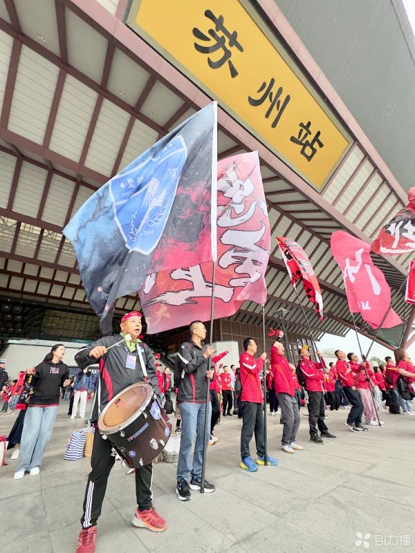 现场,球迷们整齐列阵,挥舞着蓝白相间的队旗,敲响助威战鼓,齐声高唱队歌与自编战歌。铿锵的节奏与激昂的歌声吸引了不少过往旅客驻足围观。尽管是客场作战,苏州球迷用热情将出发的站前广场变成了“流动的主场”。