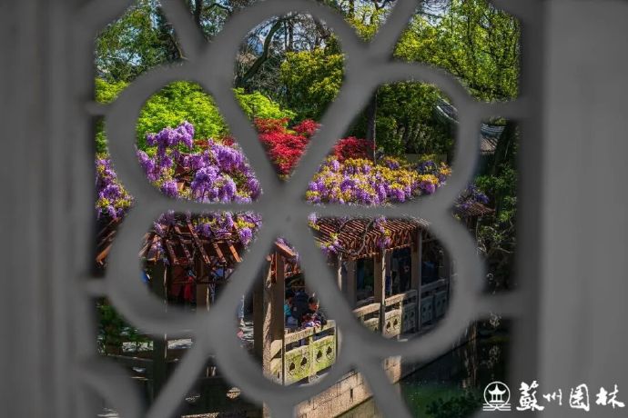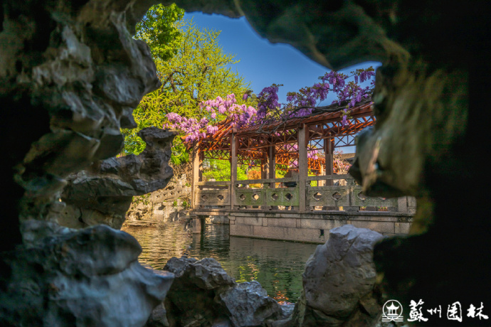 此刻狮子林最绝妙的景致,除了这满眼触手可及的姹紫嫣红,更深藏在假山迷宫深处的一扇“时空之门”内。太湖石叠垒成趣,洞孔天然成框,方寸之间自成画境。在这些错落的小洞口寻一处合适站位,向外望去,一幅令人屏息的画面豁然展现——方寸之间,四季并呈,妙不可言。