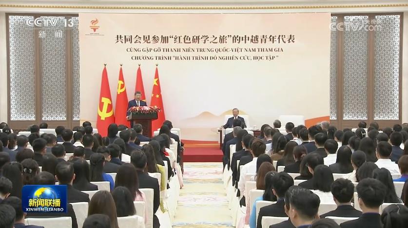 4月15日上午,中共中央总书记、国家主席习近平在人民大会堂同来华进行国事访问的越共中央总书记、国家主席苏林共同会见参加“红色研学之旅”的中越青年代表。