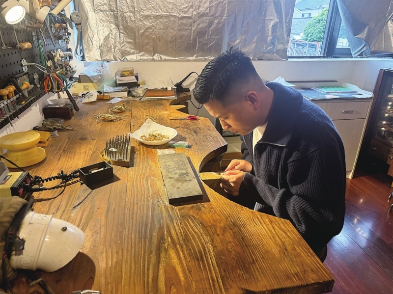 从苏州博物馆收藏的全关节可动黄金蟹,到被中国美术馆永久收藏的金蝉,从攻克钛金属与金银复合工艺的行业难题,到即将面世的吴越文化错金银系列、“百虫展”,这位扎根木渎七年的年轻手艺人,用十五年的坚守,把千年技艺做成了能戴在身上、握在手里、藏着江南文脉的活态传承。