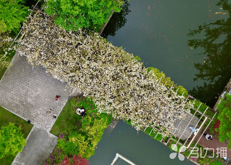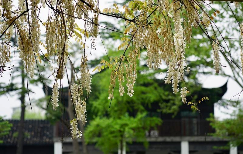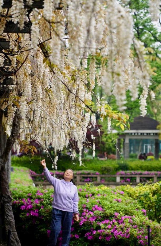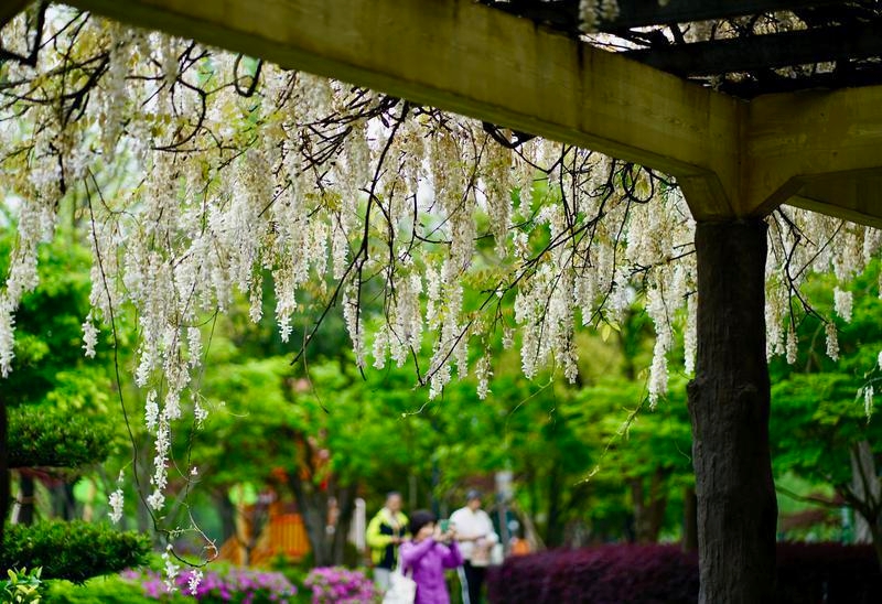 4月16日,苏州东园250年白花紫藤如约绽放,花香清甜扑鼻。串串白花垂落如白雪瀑布,引得市民游客争相打卡。虽花期近尾声,古藤依旧风姿清雅,在多彩春日里绽放出独一份的清新脱俗。(记者 杨海石 文/摄)