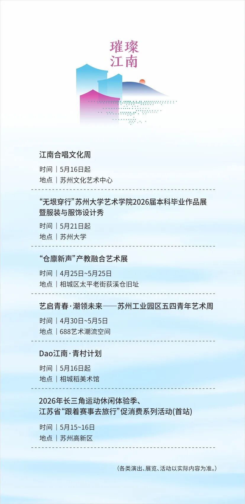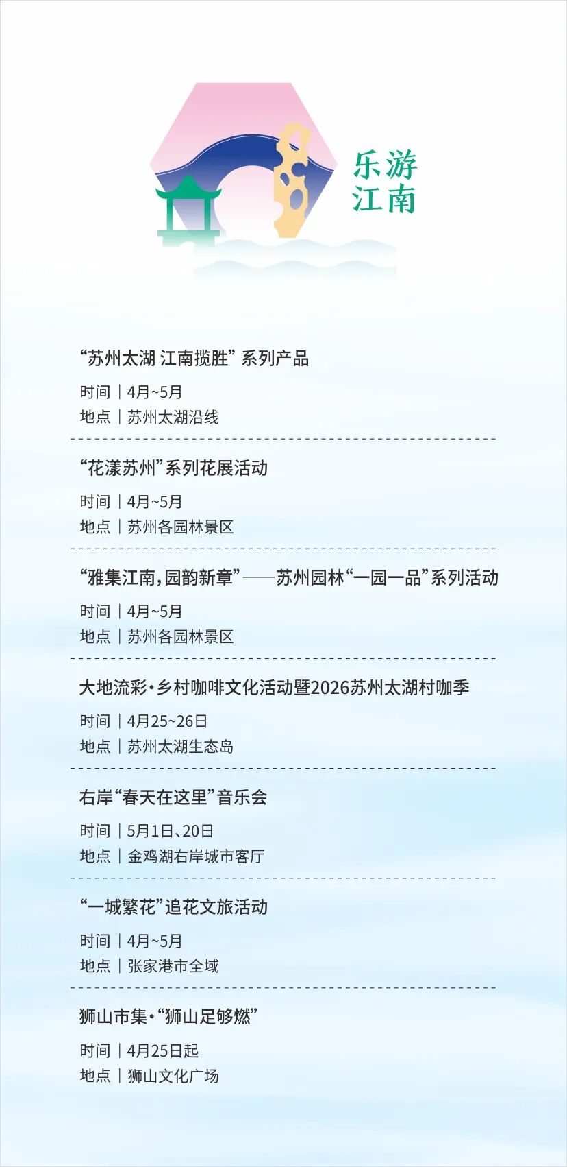 活动同时联动苏州各板块,结合当地特色打造专属文旅活动:张家港“一城繁花”系列活动、常熟虞山文化暨沙家浜旅游系列活动、“寻鲜之旅 乐享太仓”春季文旅消费季、昆山琼花艺术嘉年华、吴江“同里之春”主题活动、“跟着音乐游吴中”系列活动、相城区御窑金砖博物馆开馆十周年活动、“水韵江南 风雅姑苏”中国旅游日主题活动、园区金鸡湖桃花文化季、高新区狮山市集“狮山足够燃”,全域玩转苏州!