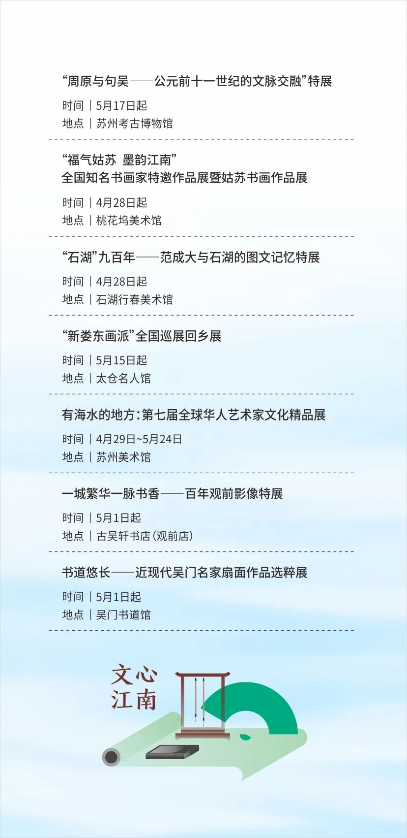 各大博物馆、美术馆和图书馆等文化场所还将带来16场主题展览和展映,包括“周原与勾吴”文物展、「石湖」九百年特展、“福气姑苏 墨韵江南”知名书画家特邀作品展等,让你尽情饱览江南文化底蕴。