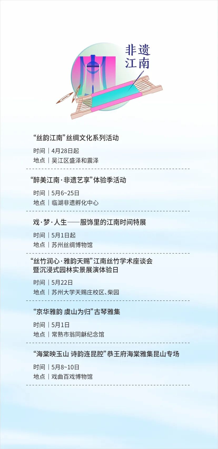 10项非遗民俗活动趣味上线!“丝韵江南”丝绸文化活动、“醉美江南・非遗艺享”体验季、“丝竹润心·雅韵天赐”园林实景丝竹赏析、“京华雅韵 虞山为归”古琴雅集、“跟着电影品美食”活动等,带你沉浸式感受江南非遗魅力。