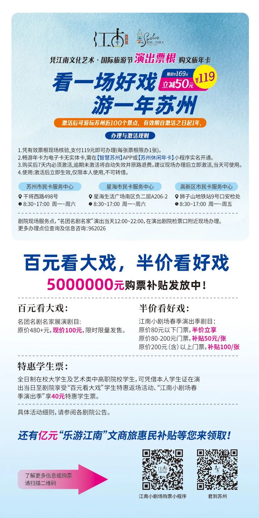 江南文旅节期间,在苏州观看演出的观众,只要持有面额100元以上的剧院票根或者购票凭证,可以就近在相关剧院现场服务点,或者指定的市民卡服务中心购买年卡,立享50元补贴。更详细的信息大家可以留意后续官方发布。