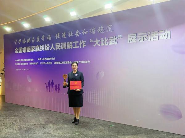 自2013年起担任昆山婚姻家庭纠纷调解员以来,她始终坚守一线为困境妇女与家庭保驾护航。她积极探索“网格+妇联”工作体系,成立乐融融法律服务中心,组建13支普法服务队、450名志愿者,累计服务超5000人次。在昆山市妇联指导下牵头成立并担任“反家暴巾帼律师团”团长,为受暴妇女提供紧急法律援助、心理疏导和危机干预,累计帮助百余名女性筑牢安全防线。作为政协委员,她深入调研674项执法行为,撰写《辅警执法存在的问题和思考》等提案,多篇立法修订意见获全国人大法工委采纳,推动《妇女权益保障法》等法规完善,为源头维权贡献了专业智慧。曾获全国婚姻家庭纠纷人民调解工作“大比武”三等奖。