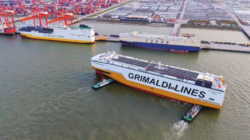 该轮全长220米,型宽38米,拥有14层甲板,可运输电动汽车、传统燃油车及其他滚装货物,满载情况下可载运9000辆汽车,同时配备了超级锂电池、岸电系统、太阳能板等多项先进环保装置,较上一代汽车运输船可降低约50%的燃油消耗。 □周哲 刘争/文